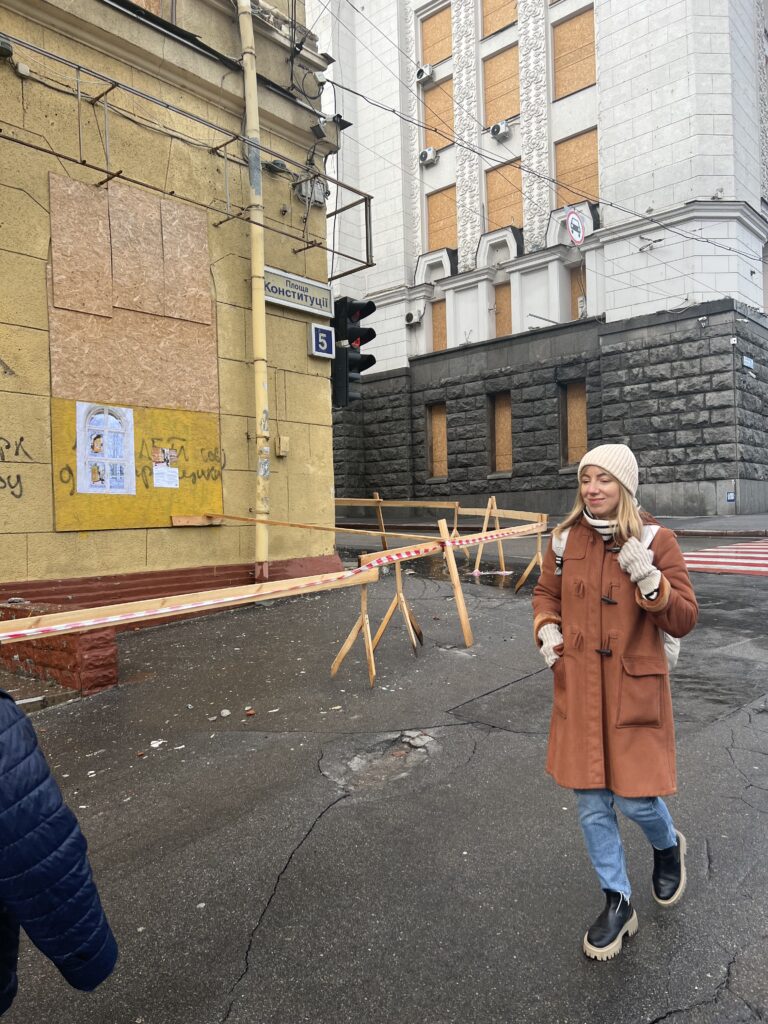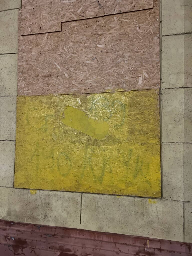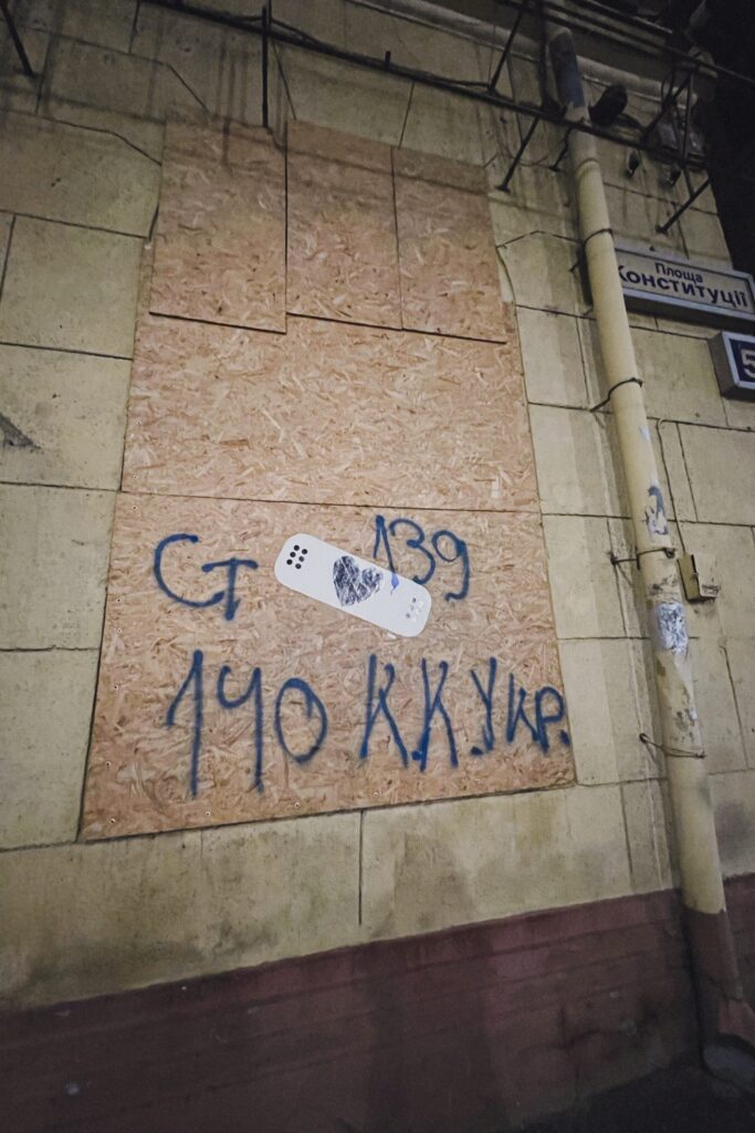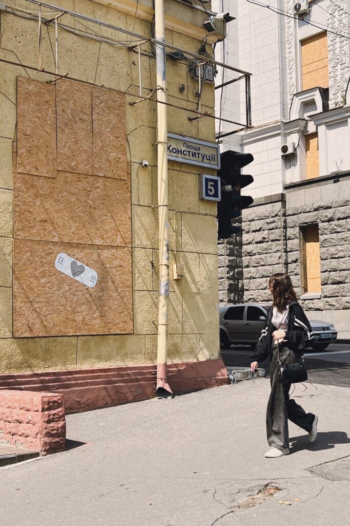 This band-aid was placed on the façade of the local business with the intention of supporting the worker, who, at the owner’s request, was fixing the storefront after it was defaced with the word “occupant” or “occupier”, which refers to the aggressor. A few years later, the storefront was fixed with a fresh layer of paint, leaving the band-aid behind it. Photo: Viktoriia Grivina