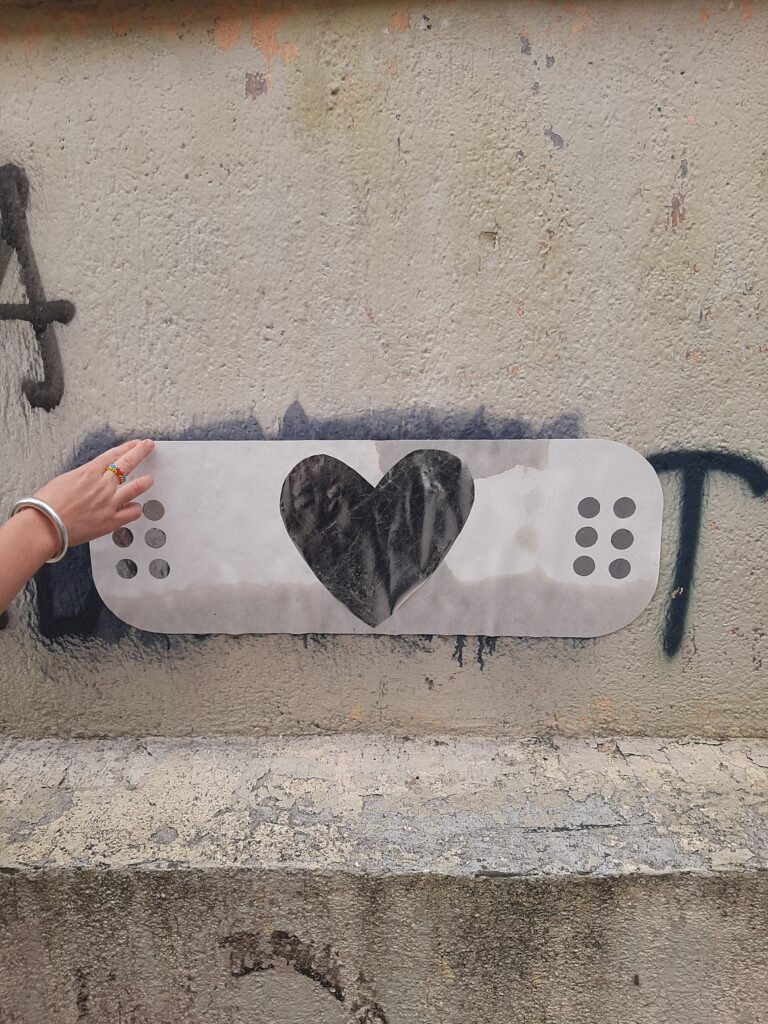 This artwork turned out to have the longest longevity. Maybe, due to its placement on a quiet side street. The top layer of the cardboard, along with the heart-shaped foil, was mysteriously lost, but the shape of the band-aid can still be found here.